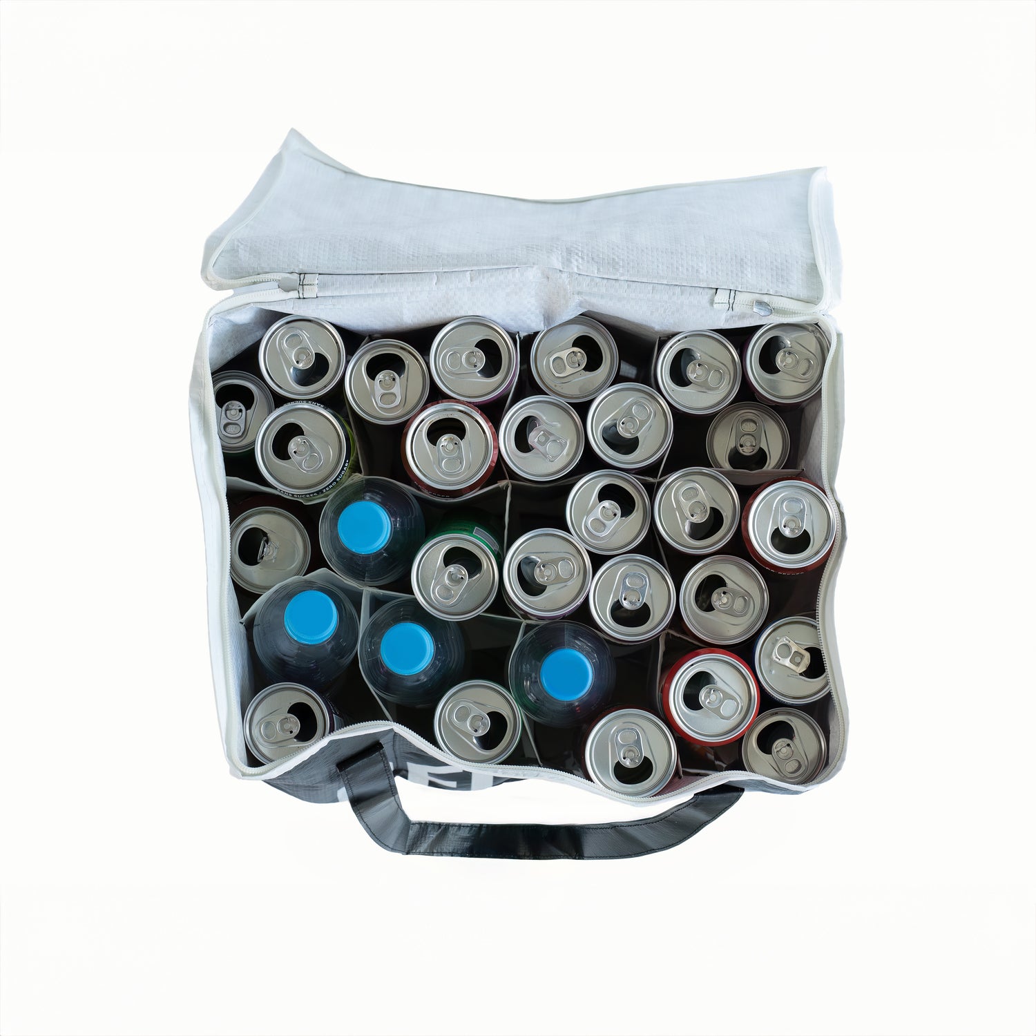 Die Abmessungen der aufgeklappten Pfandtasche betragen (L)38 x (B)28,5 x (H)50 cm. Das Innenfach hat 12 separate Fächer, in die jeweils eine 1,5-Liter-Flasche passt. Darüber können Dosen und kleinere Flaschen gestapelt werden. Wird die Tasche ausschließlich mit Dosen gefüllt, passen ca. 80 Stück hinein – das ergibt ein Pfand von etwa 12 Euro. Damit hast du den Kauf der Recyco bereits wieder ausgeglichen!