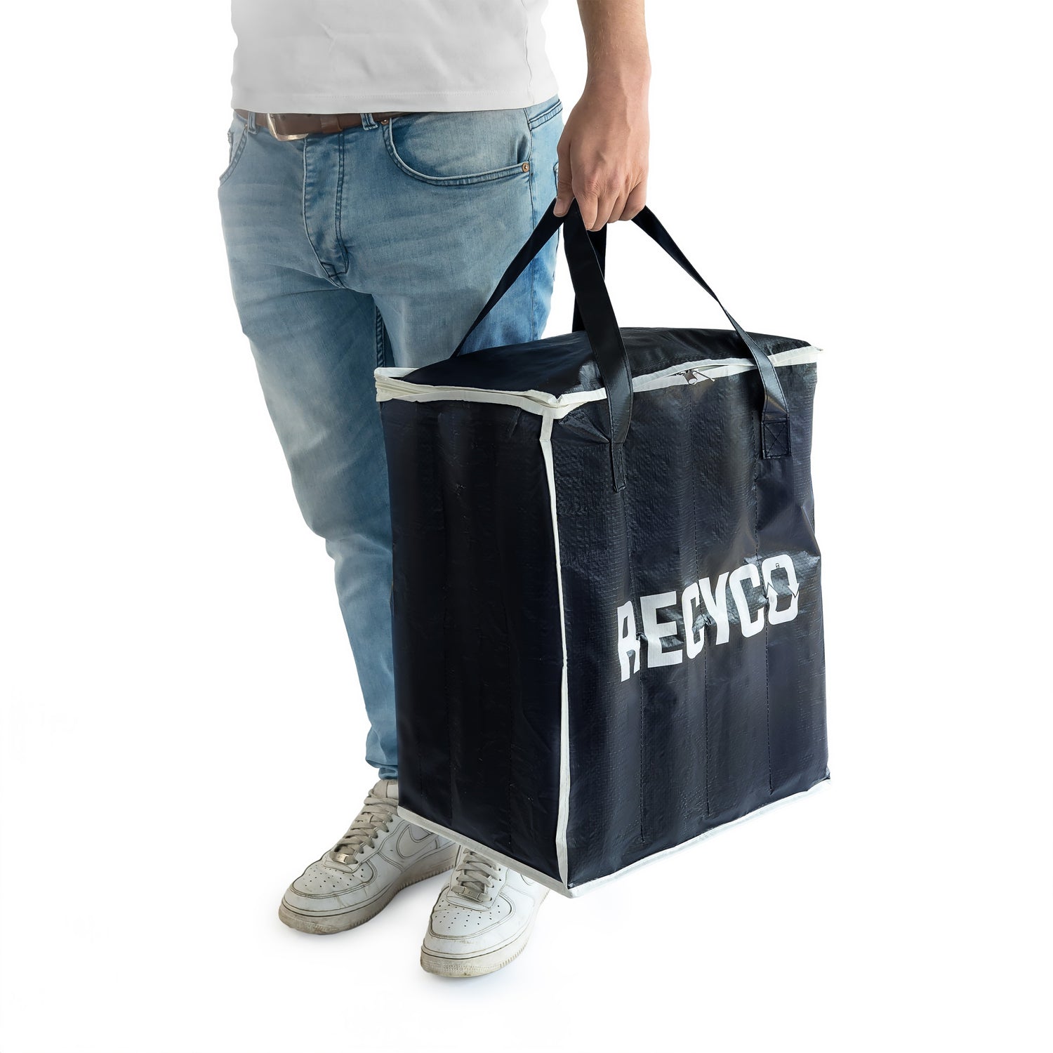 Ein Recyco ist eine Tasche zur sauberen und sicheren Aufbewahrung von Pfandverpackungen. In der Pfandtasche können Dosen, kleine Flaschen und große Flaschen aufrecht gestapelt werden. Im Gegensatz zu großen Einkaufstaschen oder Plastiktüten sammeln sich in der Recyco keine klebrigen Getränkereste. Dadurch bleibt das Pfand sauber und hinterlässt keine klebrigen Hände nach der Rückgabe. Zudem ist die Pfandtasche mit einem Reißverschluss verschließbar, sodass sie kein Ungeziefer anzieht.